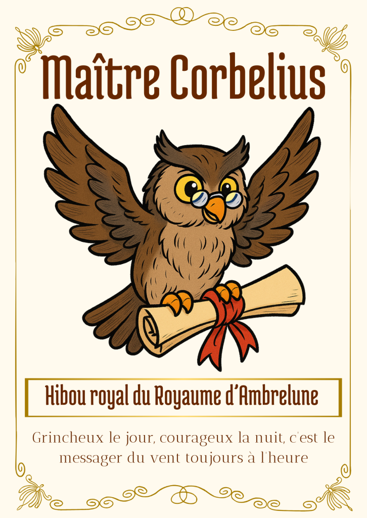 Pour donner vie à la magie, je vais fabriquer chaque lettre à la main : imprimée sur une simple feuille blanche, puis brunie au café ou au thé, légèrement brûlée sur les bords pour un effet ancien. Les lettres seront glissées dans de vieilles enveloppes patinées, fermées à la cire marron, scellées d’un hibou doré, symbole d’Ambrelune.